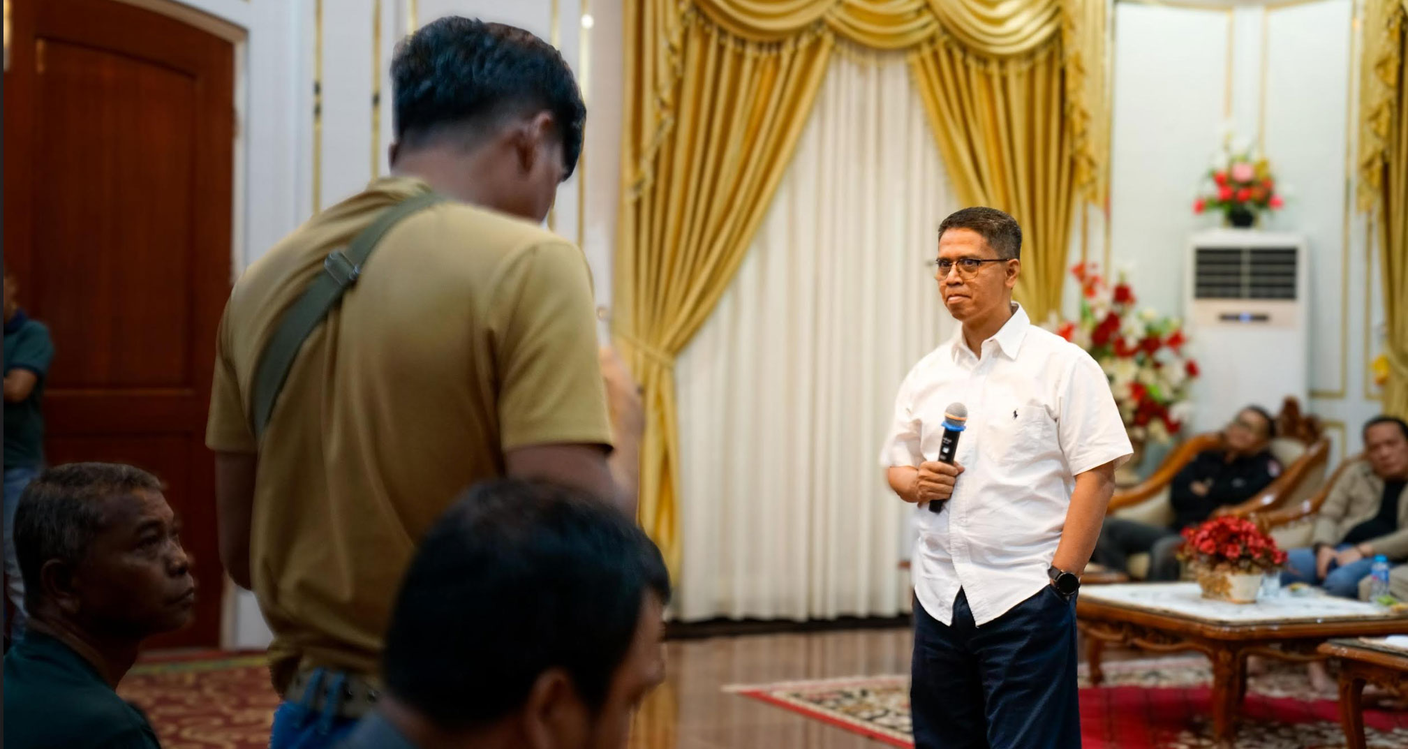 Bupati Iskandarsyah dan Wakil Bupati Rocky Marciano Bawole saat berdialog dengan pedagang Pasar Sore Puan Maimun Karimun di rumah dinas bupati. (Foto: Freddy/BTD)